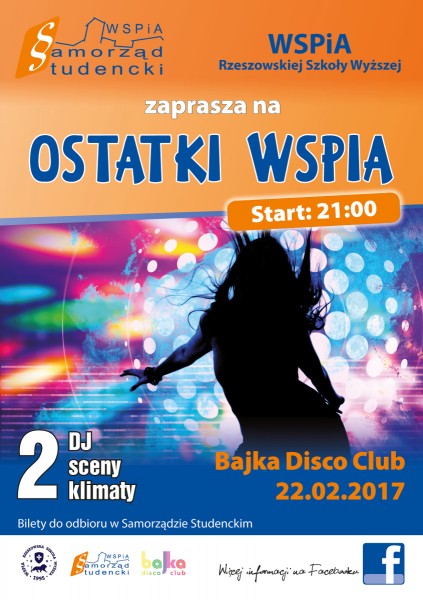 Ostatki studentów WSPiA odbędą się w Bajka Disco Club w Rzeszowie. To nowy gorący punkt na imprezowej mapie stolicy Podkarpacia doskonale znany studentom WSPiA m.in. z Otrzęsin pierwszaków. Lokal znajduje się w ścisłym centrum Rzeszowa w Centrum Handlowym Europa II. Bajka Disco Club to 900m2 przestrzeni. Sercem lokalu jest kolorowa, sterowana podłoga wraz ze ścianą.