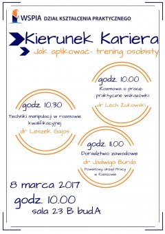 Spotkanie z cyklu „Kierunek Kariera” odbędzie się w najbliższą środę 8 marca 2017 r. początek o godzinie 10:00 w sali 23 B (parter, budynek A). Organizatorem spotkania jest Dział Kształcenia Praktycznego oraz Akademickie Biuro Karier WSPiA Rzeszowskiej Szkoły Wyższej. Szczegóły imprezy można znaleźć na stronie http://www.biurokarier.wspia.eu.