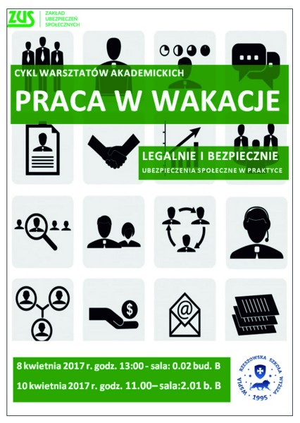 Organizatorem cyklu warsztatów akademickich pt. Praca w wakacje, legalnie i bezpiecznie – ubezpieczenia społeczne w praktyce jest Zakład Ubezpieczeń Społecznych w Rzeszowie. Celem spotkania jest przedstawienie zagadnień na temat legalności i bezpieczeństwa przy podejmowaniu pracy nie tylko w kraju, ale i za granicą.