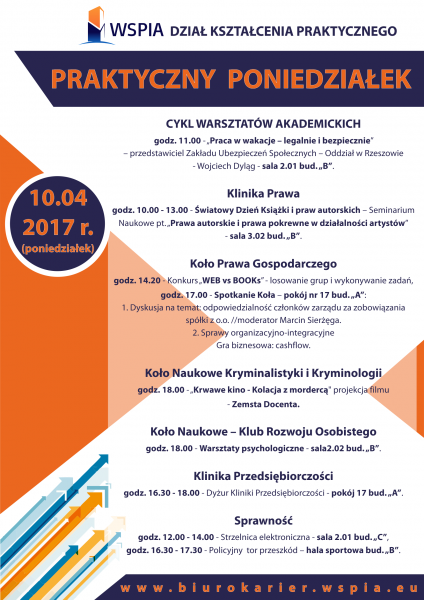 Jest to przedsięwzięcie WSPiA, które ma stworzyć studentom możliwość dodatkowej aktywności. Dzięki temu studenci mogą realizować swoje zainteresowania wykraczające poza formułę klasycznych zajęć akademickich. Dlatego Uczelnia proponuje im interesującą ofertę spędzania początku tygodnia w przyjemny i pożyteczny sposób. W każdy poniedziałek organizowane są różne formy aktywności odpowiadające zainteresowaniom studentów.