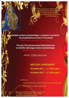 Podczas kolejnych wykładów – w poniedziałek 10 kwietnia i środę 12 kwietnia 2017 r. prof. Czesław Kłak zajmie się relacją prawa żydowskiego do prawa rzymskiego. Postara się odpowiedzieć na pytanie, czy Biblia - przedstawiając ujęcie Chrystusa - a następnie jego przesłuchanie przed kapłanami żydowskimi i sformułowanie zarzutów, opartych na prawie żydowskim i rzymskim, zawiera wiarygodny przekaz (z punktu widzenia normatywnego), czy też występują tam takie niezgodności z literą ówczesnego prawa, że nie można jej uznać za wartościowe źródło do rekonstrukcji tych wydarzeń.