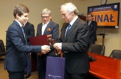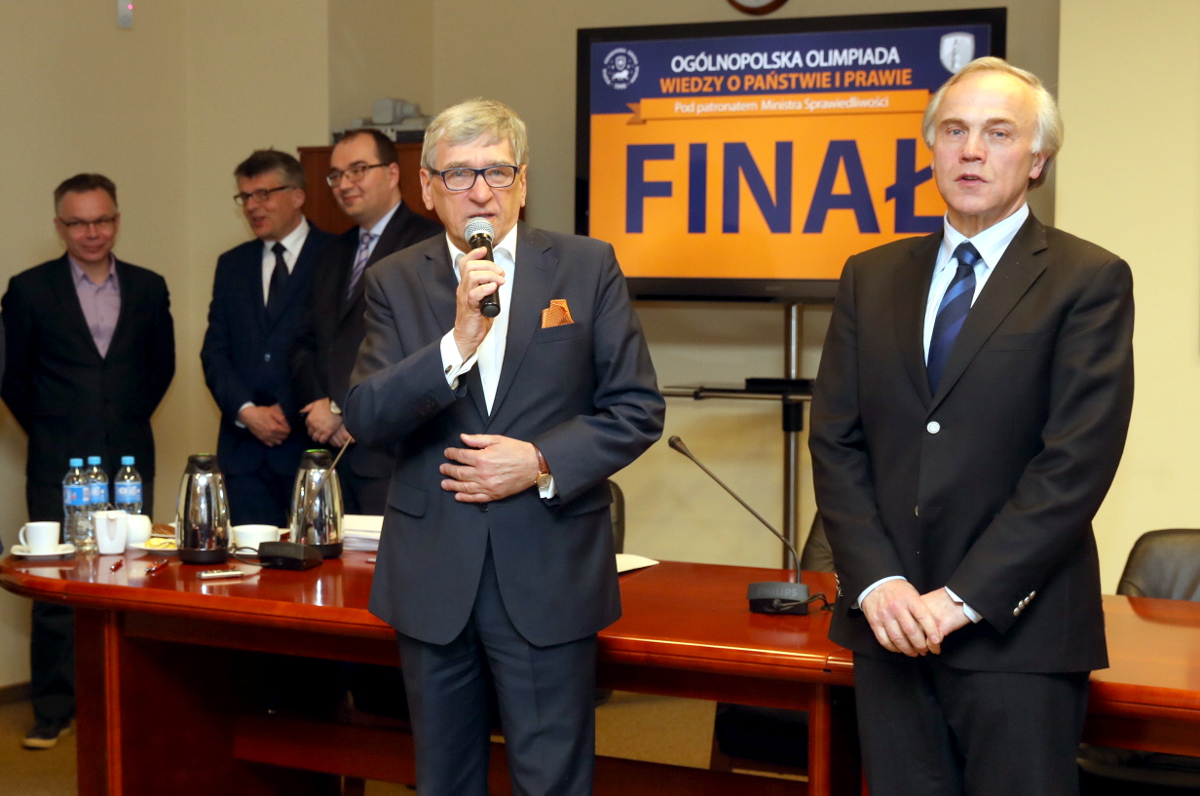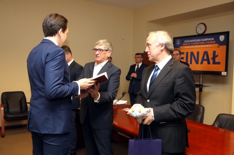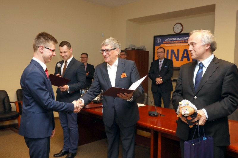 – Gratuluję wszystkim uczestnikom Finału – mówił podczas wręczenia nagród prof. Jerzy Posłuszny. – Dzisiaj pokazaliście, że Wasza wiedza jest na bardzo wysokim poziomie. Co roku, kiedy przygotowujemy Ogólnopolską Olimpiadę Wiedzy o Państwie i Prawie podnosimy poprzeczkę wymagań. W ósmej edycji jest ona ustawiona już bardzo wysoko. Mimo to 33 uczestników finału, a w szczególności 10 finalistów doskonale poradziła sobie z dość trudną tematyką związaną z Państwem i Prawem. Chce także pogratulować rodzicom, opiekunom i nauczycielom, którzy pomogli w przygotowaniu uczniów do Olimpiady. Ich wkład w rozwój młodych ludzi jest nieoceniony – powiedział prof. Jerzy Posłuszny.