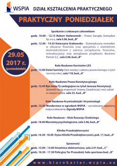 Jest to przedsięwzięcie WSPiA, które ma stworzyć studentom możliwość dodatkowej aktywności. Dzięki temu studenci mogą realizować swoje zainteresowania wykraczające poza formułę klasycznych zajęć akademickich. Dlatego Uczelnia proponuje im interesującą ofertę spędzania początku tygodnia w przyjemny i pożyteczny sposób. W każdy poniedziałek organizowane są różne formy aktywności odpowiadające zainteresowaniom studentów.