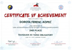 Dr Dorota Ferenc-Kopeć podczas zawodów reprezentowała Rzeszowski Klub Sportowy „Nan Bei – Tygrys”. Jej mistrzem jest Zhang Feng Jun, a trenerami utytułowani zawodnicy Tai-Chi Robert Mrózek oraz Ewa Solarz. Wykładowca WSPIA po doskonałych prezentacjach tradycyjnego chińskiego systemu ćwiczeń wywalczyła srebrny medal i tytuł wicemistrza Polski seniorek w Tai-Chi w formach obligatoryjnych 24 i 40.