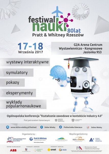 Festiwal Nauki 2017 to największa impreza popularnonaukowa w regionie, która jest adresowana do wszystkich mieszkańców Podkarpacia. Ideą festiwalu jest popularyzacja nauki i najważniejszych osiągnięć naukowych. Festiwal jest częścią obchodów 80-lecia istnienia Pratt&Whitney Rzeszów, dawnego WSK „PZL-Rzeszów” S.A. W programie imprezy znalazły się ciekawe wykłady, spektakularne pokazy naukowe i strefę pikniku naukowego, w której znajdzie się ponad 50 stanowisk. Podczas festiwalu będzie można zobaczyć wynalazki i eksponaty naukowe, roboty, drony, eksperymenty chemiczne i fizyczne, poznać tajniki nowoczesnych technologii IT, spróbować swoich sił na symulatorach lotu, a także rozwiązać łamigłówki i bawić się nauką. Gościem festiwalu będzie robot EuGenius, który chętnie porozmawia i zrobi sobie zdjęcie z uczestnikami imprezy. Ponadto na odwiedzających czekają dwie wystawy interaktywne. Podczas Festiwali odbędzie się również Kongres Robotyczny, połączony z prezentacjami nowoczesnych, zaawansowanych robotów.