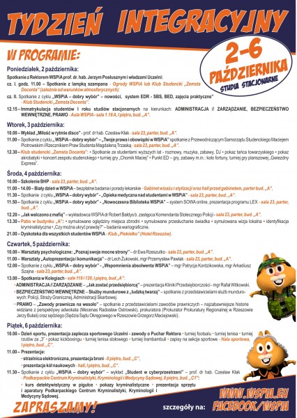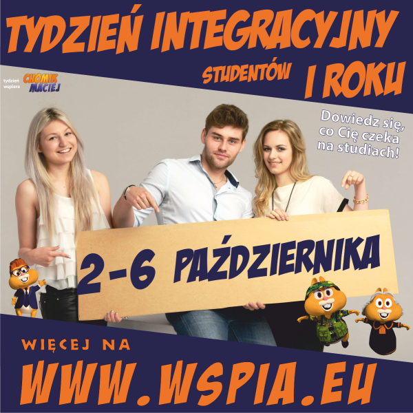 Tydzień Integracyjny to propozycja Uczelni, która pozwala poznać się i zintegrować studentom rozpoczynającym naukę w WSPiA. Wszystkie zaplanowane wydarzenia rozpoczną się w poniedziałek 2 października i potrwają do piątku 6 października 2017 r.