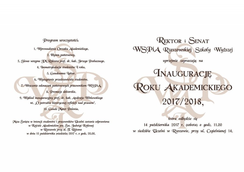 Inauguracja roku akademickiego 2017/2018 w WSPiA odbędzie się w sobotę 14 października 2017 r. o godzinie 11:00 w Auli rzeszowskiego kampusie Uczelni, przy ul. Cegielnianej 14. Dzień później w niedzielę (15 października) odprawiona zostanie Msza Święta w intencji studentów i pracowników Uczelni. Msza rozpocznie się o godzinie 20:00 w Kościele Akademickim pw. Św. Jadwigi Królowej w Rzeszowie przy al. T. Rejtana.