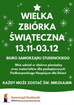 Wielka Zbiórka Świąteczna w WSPiA organizowana jest pod hasłem „Zostań Świętym Mikołajem”. Potrwa do niedzieli 3 grudni 2017 r. W akcję przygotowaną przez Samorząd Studencki Uczelni można się włączyć na dwa sposoby. Pierwszy to wrzucenie pieniędzy do specjalnej skarbonki w pokoju Samorządu Studenckiego. Za zebrane środki kupione zostaną materiały i zabawki, które otrzymają podopieczni Fundacji „Podkarpackie Hospicjum dla dzieci”.