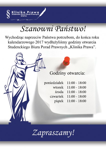 Nowe godziny pracy Kliniki Prawa WSPiA