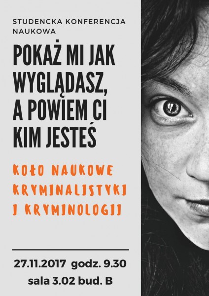 Konferencja pt. "Pokaż mi jak wyglądasz, powiem Ci kim jesteś" odbędzie się w najbliższy poniedziałek 27 listopada 2017 r. Początek o godzinie 9:30 w Sali 3.02 w Budynku B. Organizatorem dyskusji jest działające w WSPiA Koło Naukowe Kryminalistyki i Kryminologii.