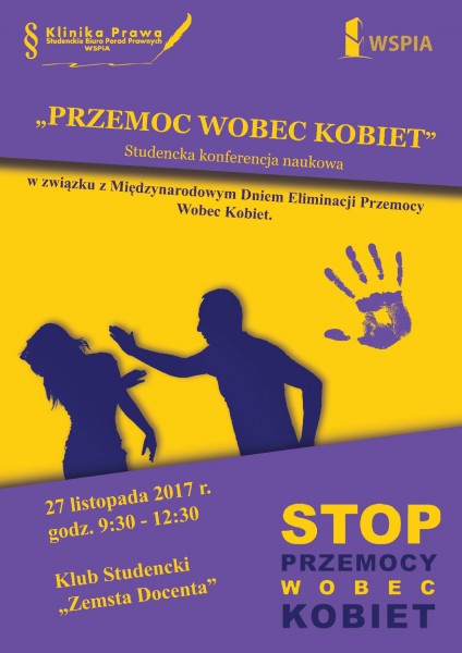 Konferencja naukowa nt. „Przemoc wobec kobiet” organizowana jest przez działające w WSPiA Rzeszowskiej Szkle Wyższej Studenckie Biuro Porad Prawnych „Klinikę Prawa”. Do udziału w dyskusji zapraszamy w najbliższy poniedziałek 27 listopada 2017 r. Początek o 9:30 w klubie studenckim „Zemsta Docenta”.
