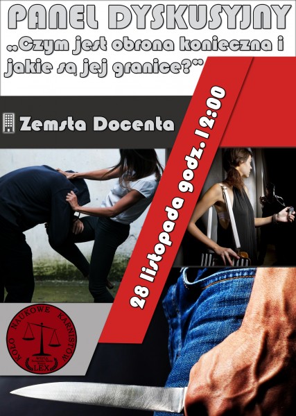 Studencki panel dyskusyjny pt. „Czym jest obrona konieczna i jakie są jej granice” organizowany jest przez działające w WSPiA Rzeszowskiej Szkole Wyższej Koło Naukowe Karnistów „LEX”. Dyskusja odbędzie się we wtorek 28 listopada 2017 r. o godzinie 12:00. Zainteresowanych zapraszamy do klubu studenckiego „Zemsta Docenta”.