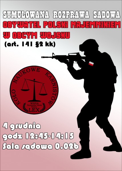Druga przygotowana przez studentów rozprawa będzie dotyczyła służby polskiego obywatela w obcym wojsku. Przestępstwo, na podstawie którego będzie odpowiadał oskarżony, wynika z artykułu 141 § 2 kk., czyli „kto przyjmuje obowiązki w zakazanej przez prawo międzynarodowe wojskowej służbie najemnej, podlega karze pozbawienia wolności od 6 miesięcy do lat 8”. Rozprawę przygotowali studenci z działającego w WSPiA Koła Naukowego Karnistów LEX. Do udziału w symulacji zapraszamy w poniedziałek 4 grudnia 2017 r. o godzinie 12:45. Tę prezentację będzie można zobaczyć w Sali Rozpraw WSPiA (parter budynek B).