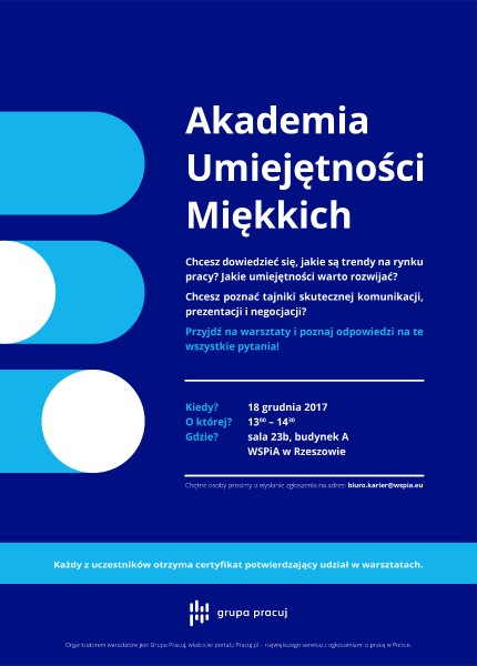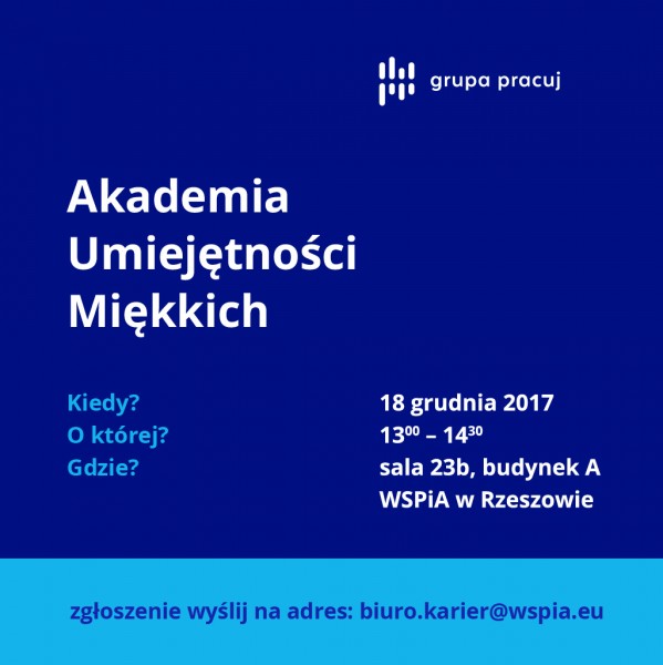 Akademia Umiejętności Miękkich to warsztaty z przedstawicielami Grupy Pracuj, właściciela portalu Pracuj.pl. Zajęcia trwają 1,5 godziny. Każdy uczestnik otrzyma certyfikat potwierdzający udział w szkoleniu. Podczas zajęć w ramach Akademii Umiejętności Miękkich studenci WSPiA będą mogli dowiedzieć się jakie są obecne trendy na rynku pracy. Dowiedzą się także jakie umiejętności i kompetencje społeczne i interpersonalne warto rozwijać oraz w jaki sposób takie umiejętności mogą pomóc w poszukiwaniu dobrej pracy. Jednym z elementów szkolenia jest także wprowadzenie do sztuki komunikacji, prezentacji i negocjacji, czyli umiejętności przydatnych nie tylko w pracy zawodowej. Dodatkowo po zakończeniu szkolenia zainteresowani studenci będą mogli skonsultować swoje CV oraz porozmawiać z przedstawicielami Grupy Pracuj.