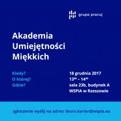Akademia Umiejętności Miękkich w WSPiA Rzeszowskiej Szkole Wyższej odbędzie się w najbliższy poniedziałek 18 grudnia 2017 r. w Sali 23 B (budynek A). Szkolenie rozpocznie się o godzinie 13:00. Studentów zainteresowanych udziałem w warsztatach prosimy o wysłanie zgłoszenia na adres: biuro.karier@wspia.eu.