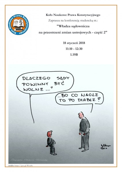 Konferencja pt. „Władza sądownicza na przestrzeni zmian ustrojowych” odbędzie się w czwartek 18 stycznia 2018 r. Początek dyskusji o godzinie 11:10 w Sali 1.19 B (I piętro Budynek A). Organizatorem spotkania jest działające w WSPiA Koło Naukowe Prawa Konstytucyjnego.