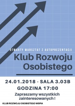 Mini warsztaty z autoprezentacji odbędą się w najbliższą środę 24 stycznia 2018 r. Początek o godzinie 17.00. Zainteresowanych zapraszamy do Sali 3.03 w budynku B. Organizatorem spotkania jest działający w WSPiA Rzeszowskiej Szkole Wyższej Klub Rozwoju Osobistego.