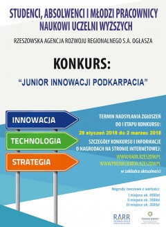 Tegoroczny konkurs Junior Innowacji Podkarpacia organizowany jest już po raz ósmy. Jego główną ideą jest kształtowanie postaw przedsiębiorczych oraz zachęcanie studentów, absolwentów oraz młodych pracowników naukowych uczelni wyższych do rozpoczęcia własnej działalności gospodarczej charakteryzującej się wysoką innowacyjnością.