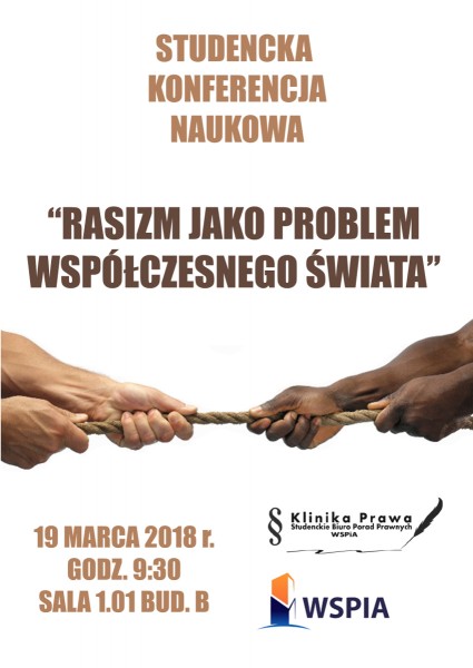 Konferencja "Rasizm jako problem współczesnego świata" odbędzie się w poniedziałek 19 marca 2018 r., o godzinie 9:30 w sali 1.01 (budynek B). Organizatorem wydarzenia jest działające w WSPiA Studenckie Biuro Porad Prawnych „Klinika Prawa”.