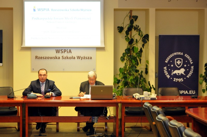 Wykład prof. Tadeusza Erecińskiego na temat „Funkcji Sądu Najwyższego w sprawach cywilnych” zorganizowany został w ramach Podkarpackiego Forum Myśli Prawniczej – sekcja prawa cywilnego. Prof. Tadeusz Ereciński to jeden z najwybitniejszych polskich prawników specjalizujący się w postępowaniu cywilnym. Przez ponad 25 lat był sędzią oraz prezesem Sądu Najwyższego kierującym pracami Izby Cywilnej. Był członkiem Komisji ds. Reformy Prawa Cywilnego przy Ministrze Sprawiedliwości oraz wiceprzewodniczącym Komisji Kodyfikacyjnej Prawa Cywilnego. Jest ekspertem Rady Europy, członkiem Komitetu Nauk Prawnych Polskiej Akademii Nauk oraz Europejskiej Komisji ds. Wymiaru Sprawiedliwości. Prof. Tadeusz Ereciński jest autorem ponad 120 publikacji z zakresu postępowania cywilnego, organizacji wymiaru sprawiedliwości i socjologii prawa (książek, rozpraw, artykułów i części prac zbiorowych oraz glos).