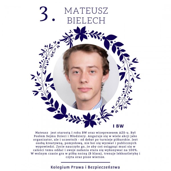3. Bielech Mateusz – I rok studiów I stopnia na kierunku „bezpieczeństwo wewnętrzne”