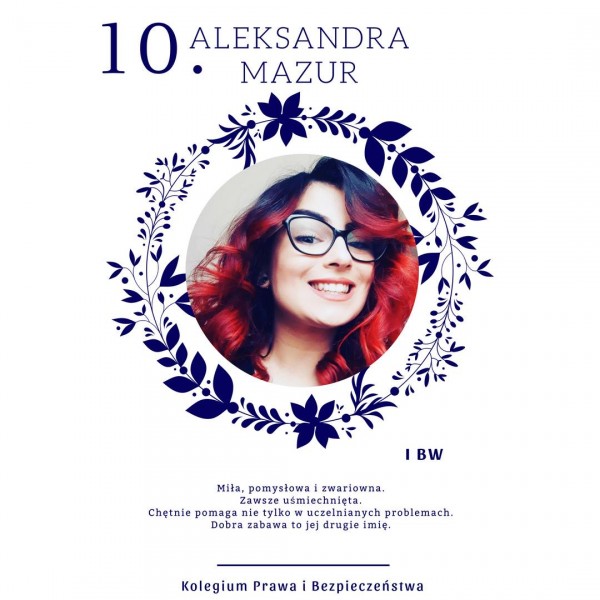 10. Mazur Aleksandra – I rok studiów I stopnia na kierunku „bezpieczeństwo wewnętrzne”