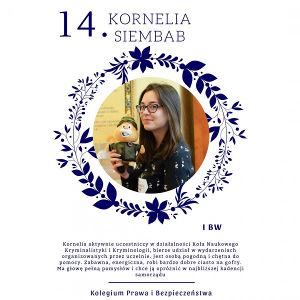 14. Siembab Kornelia – I rok studiów I stopnia na kierunku „bezpieczeństwo wewnętrzne”