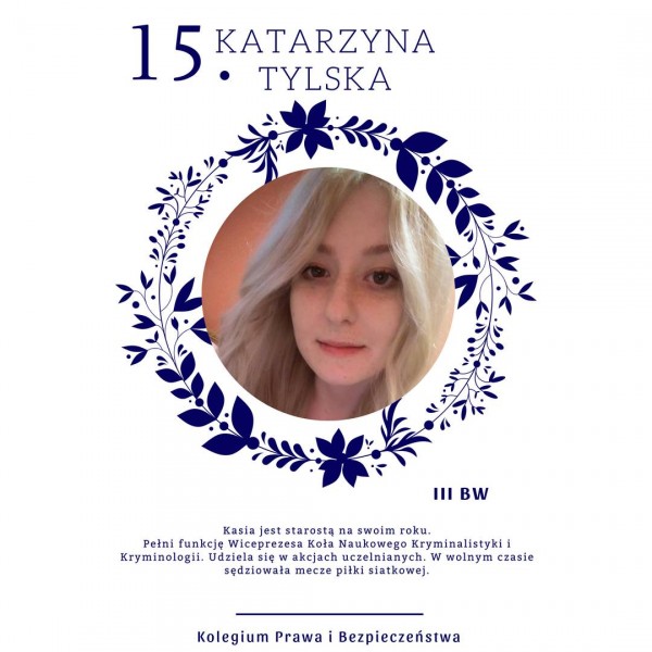 15. Tylska Katarzyna – III rok studiów I stopnia na kierunku „bezpieczeństwo wewnętrzne”
