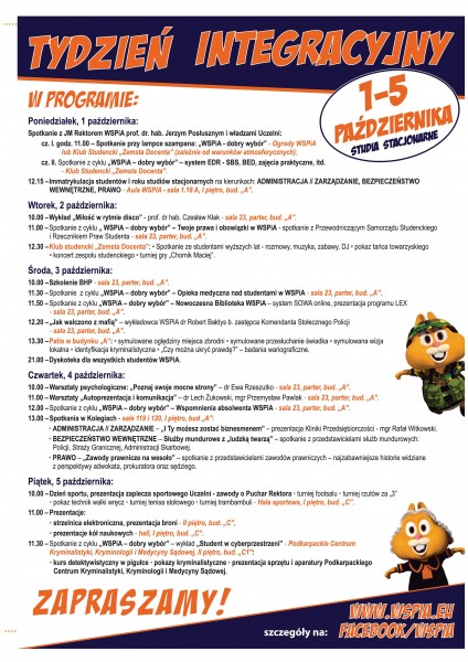 Tydzień Integracyjny 2018 rozpocznie się w poniedziałek 1 października 2018 r. punktualnie o godzinie 11:00. Nowi studenci powitani zostaną przez prof. dr. hab. Jerzego Posłusznego, Rektora WSPiA w ogrodach Uczelni. Tam czekać na nich będzie także powitalna lampka szampana. Później spotkanie przeniesie się do klubu studenckiego „Zemsta Docenta” gdzie pod hasłem „WSPiA – dobry wybór” nowi studenci będą mogli poznać system EDR - SBS, BED i dowiedzieć się więcej o zajęciach praktycznych oferowanych przez WSPiA. Pierwszy dzień zakończy Immatrykulacja studentów I roku studiów stacjonarnych na kierunkach: ADMINISTRACJA // ZARZĄDZANIE, BEZPIECZEŃSTWO WEWNĘTRZNE oraz PRAWO. Na tę część zapraszamy o godzinie 12:15 do Auli (sala 1.18) na pierwszym piętrze w budynku „A”.