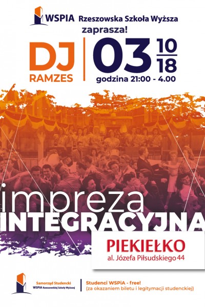 Impreza integracyjna odbędzie się w środę 3 października 2018 r. o godzinie 21:00. Studenci WSPiA będą mogli bawić się w rzeszowskim Klubie Piekiełko. Imprezę rozkręci doskonale znany naszym studentom „DJ Ramzes”. „Piekiełko” znajduje się przy ul. Piłsudskiego, na IV piętrze w Hotelu Rzeszów.