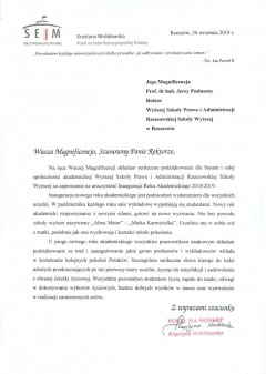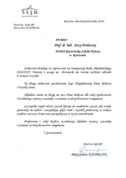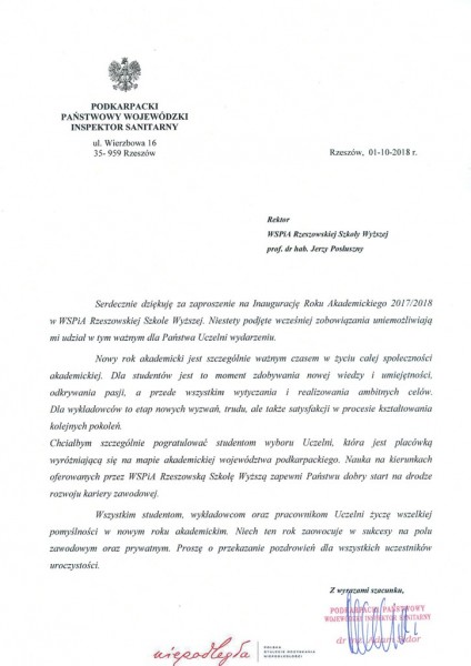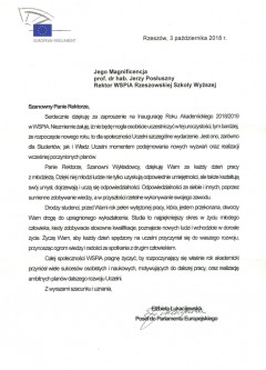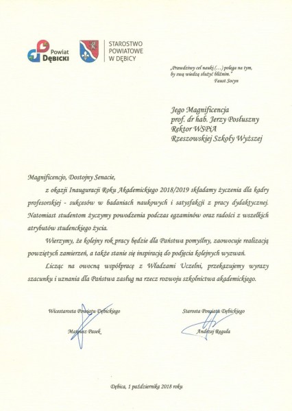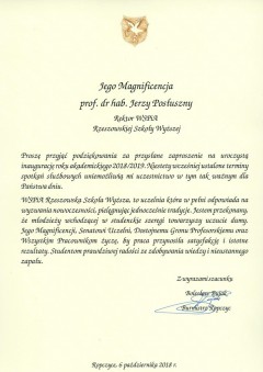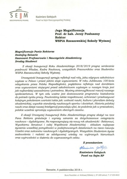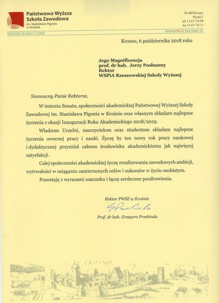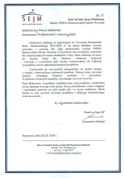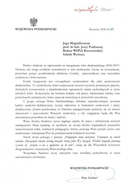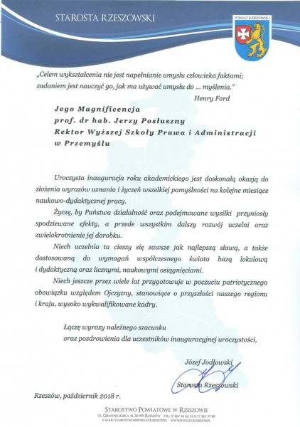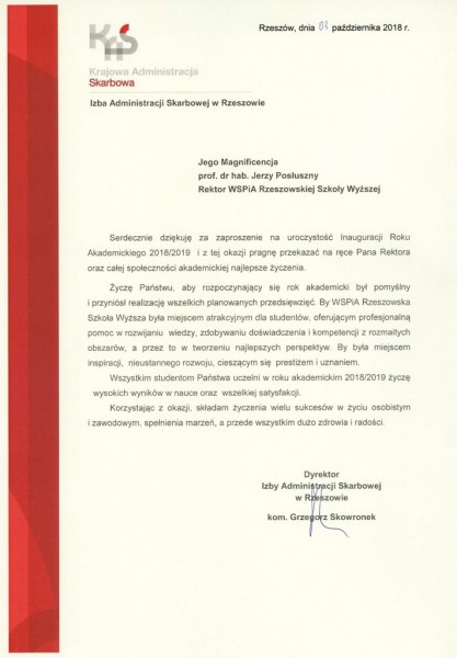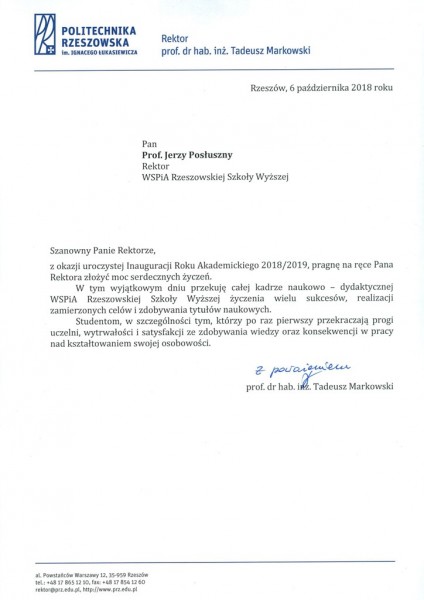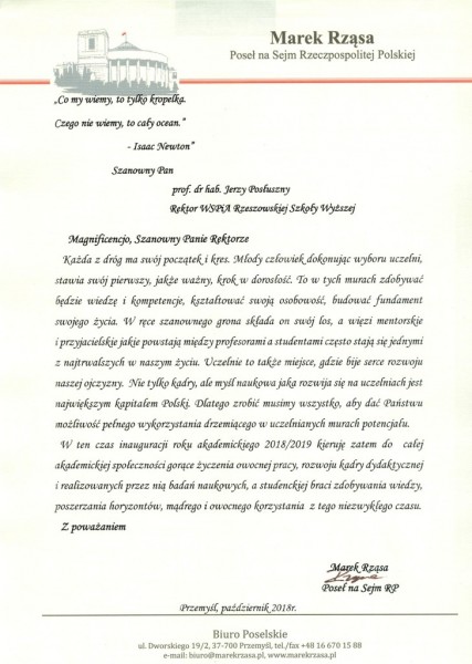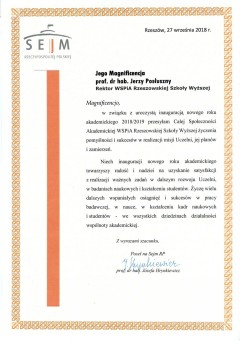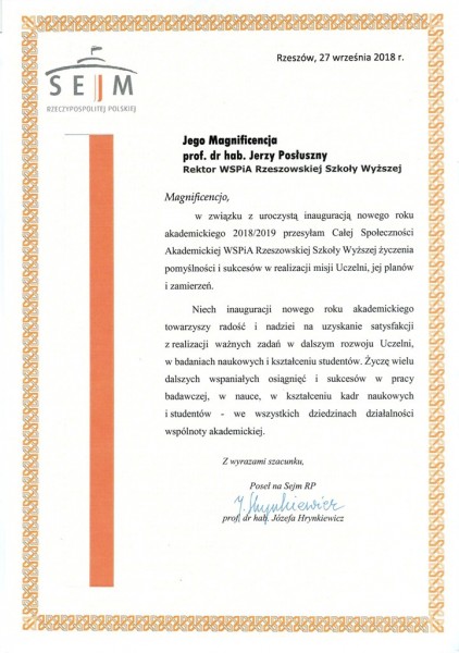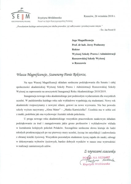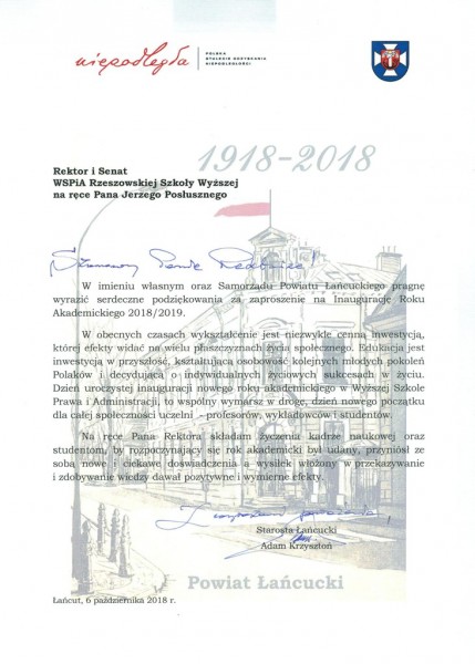 Listy gratulacyjne na Inaugurację roku akademickiego 2018/2019 w WSPiA Rzeszowskiej Szkole Wyższej:
