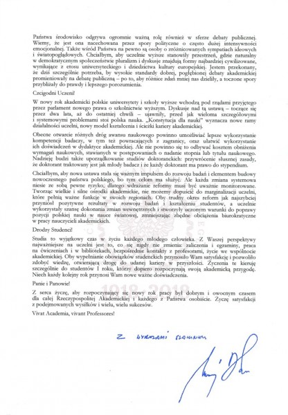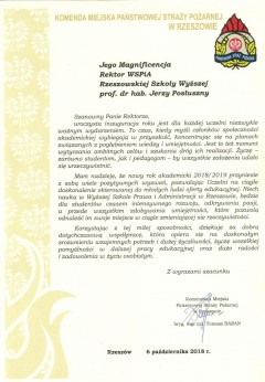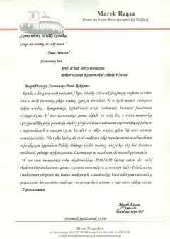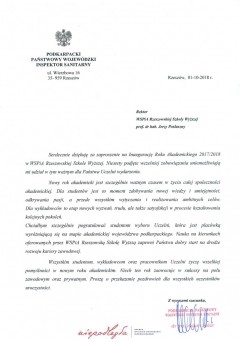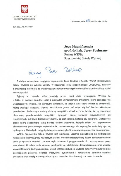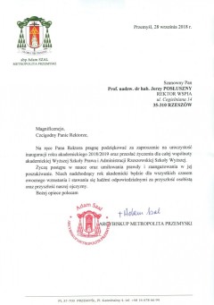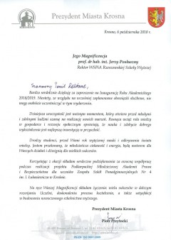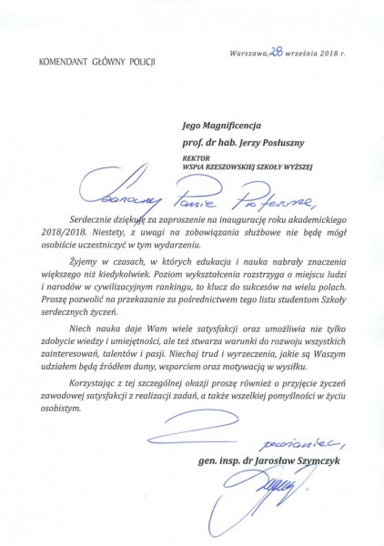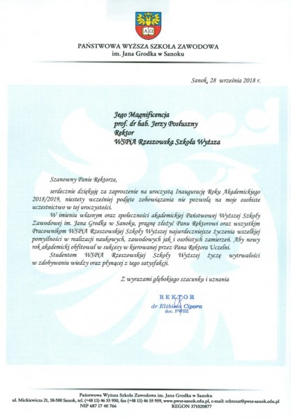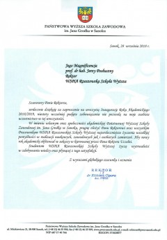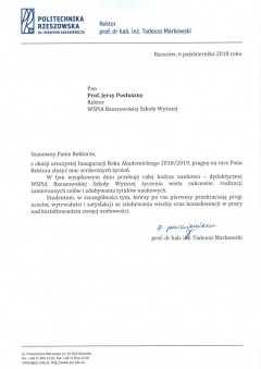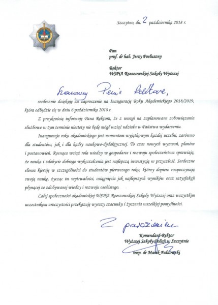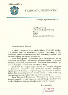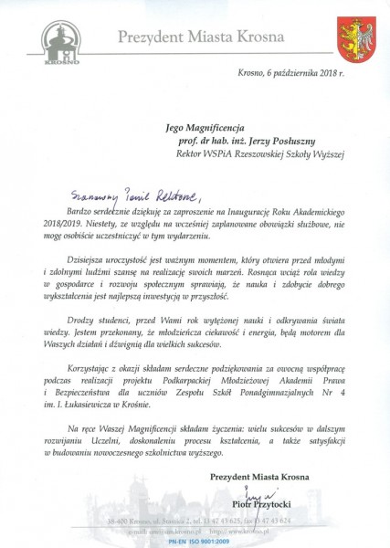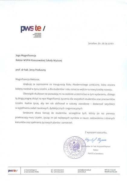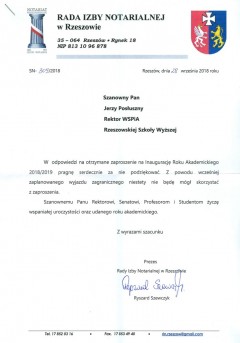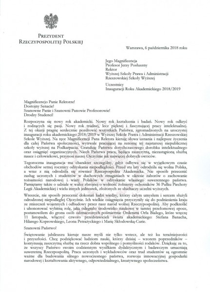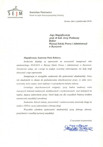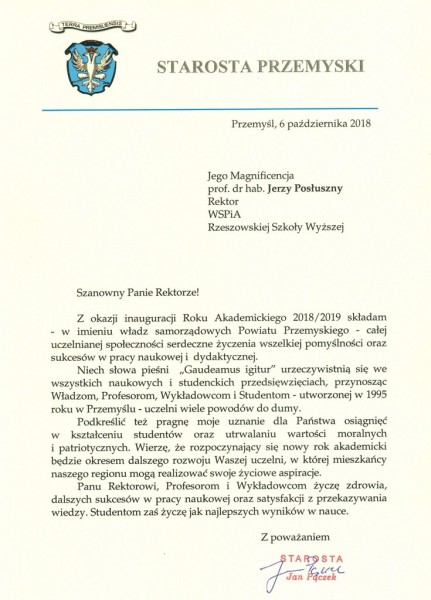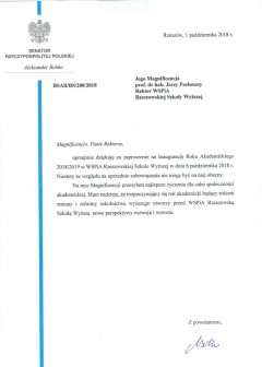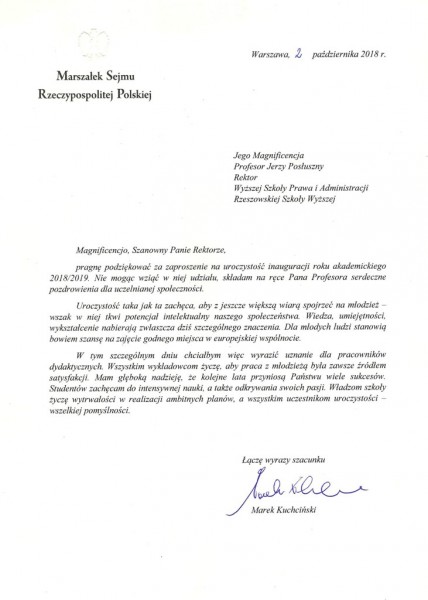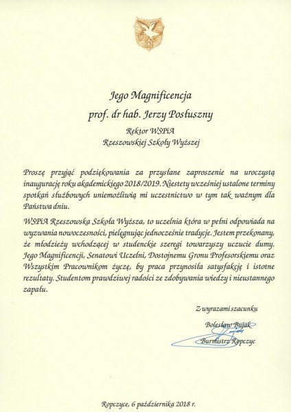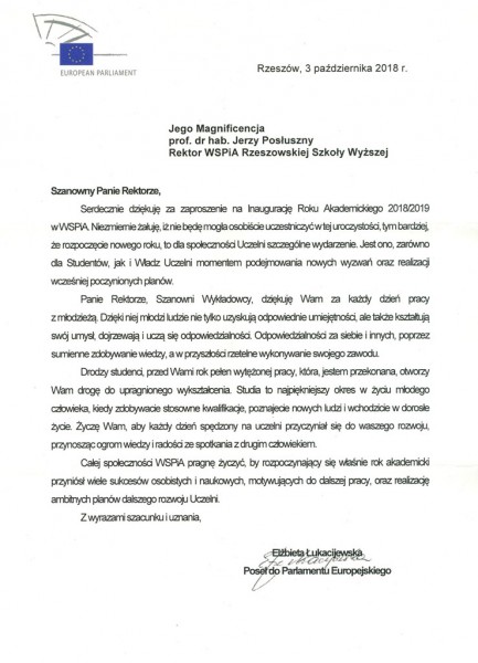 Listy gratulacyjne na Inaugurację roku akademickiego 2018/2019 w WSPiA Rzeszowskiej Szkole Wyższej: