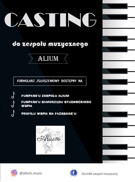 Teraz członkowie zespołu „Alium” poszukują nowych artystów, którzy chcą pokazać swój talent innym studentom. Do udziału w castingu zapraszamy wszystkich studentów studiów stacjonarnych i niestacjonarnych. Wystarczy, że potrafisz dobrze śpiewać lub grac na jakimś instrumencie.
