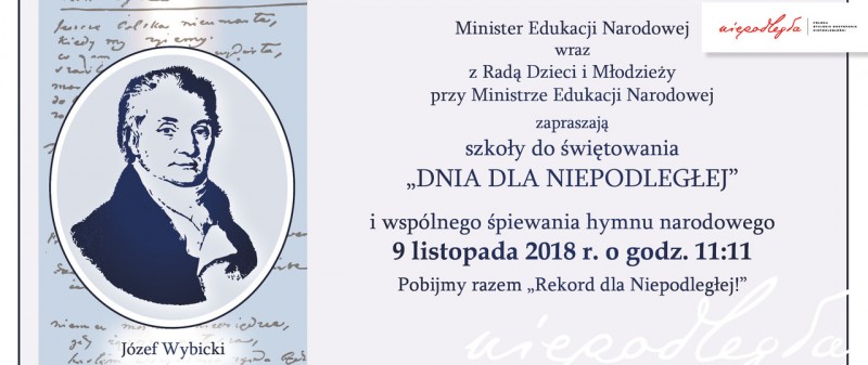 Akcja „Rekord dla Niepodległej” organizowana jest w ramach 100. rocznicy odzyskania niepodległości przez Polskę. W ramach akcji w piątek 9 listopada 2018 r. o godzinie 11:11 w całej Polsce wspólnie odśpiewany zostanie 4-zwrotkowy hymn narodowy. Organizatorem przedsięwzięcia jest Ministerstwo Edukacji Narodowej oraz Rada Dzieci i Młodzieży przy MEN.
