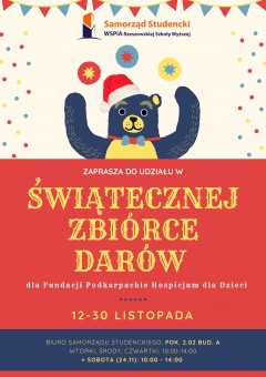 Świąteczna zbiórka darów w WSPiA Rzeszowskiej Szkole Wyższej potrwa do piątku 30 listopada 2018 r. W akcję przygotowaną przez Samorząd Studencki Uczelni można się włączyć, przynosząc do biura Samorządu Studenckiego wybrane produkty, które potrzebne są w codziennej pracy Hospicjum. Mogą to być np. słodycze, zabawki, kosmetyki i środki higieniczne (pełna lista znajduje się poniżej). Wszystkie zebrane rzeczy trafią do podopiecznych Fundacji Podkarpackie Hospicjum dla dzieci przed Mikołajkami. Dzięki temu wizyta Św. Mikołaja stanie się dla dzieci i ich rodzin wyjątkowa.