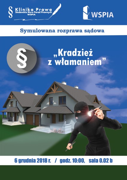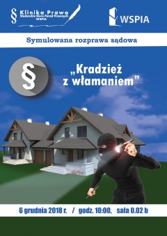 Tym razem zapraszamy do zobaczenia symulacji przygotowanej przez Studenckie Biuro Porad Prawnych „Klinika Prawa”. Podczas prezentacji przedstawia rozprawę dotyczącą przestępstwa kradzieży z włamaniem. Studenci dowiedzą się, jakie są znamiona takiego przestępstwa oraz jaki wymiar kary grozi za jego popełnienie. Studenci postarają się przybliżyć modelowy przebieg rozprawy sądowej, a więc m.in. akt oskarżenia, postępowanie dowodowe i wydanie wyroku. Podczas rozprawy zobaczyć będzie można reakcje stron procesowych na przebieg zdarzeń. Zaprezentowana zostanie mowa obrończa i oskarżycielska.