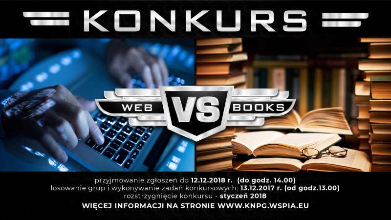 Na zgłoszenia zespołów chcących uczestniczyć w konkursie Web vs. Book czekamy do środy 12 grudnia 2018 r. do godziny 14.00. Losowanie grup i wykonywanie zadania konkursowego odbędzie się dzień później w czwartek 13 grudnia 2018 r. o godzinie 13.00. Zwycięzców poznamy na początku stycznia 2019 r.