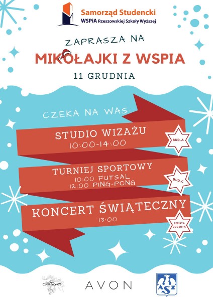 Mikołajki 2018 organizuje Samorząd Studencki WSPiA Rzeszowskiej Szkoły Wyższej przy współpracy z KU AZS, AVON oraz Zespołu Muzycznego "Alium". Impreza odbędzie się w najbliższy wtorek 11 grudnia 2018 r. w godzinach od 10:00 do 14:00.