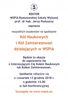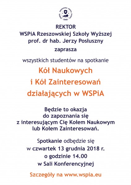 Przypominamy – spotkanie Kół Naukowych i Kół Zainteresowań odbędzie się w najbliższy czwartek 13 grudnia 2018 r. o godzinie 14.00 w Sali Konferencyjnej WSPiA Rzeszowskiej Szkoły Wyższej.