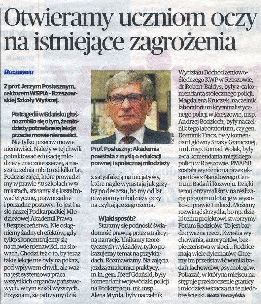Rozmowa z prof. Jerzym Posłusznym, Rektorem WSPiA Rzeszowskiej Szkoły Wyższej dostępna jest także na portalu nowiny24.pl. W wywiadzie Redaktor Beaty Terczyńską można przeczytać o potrzebie systemowej pracy wszystkich organów i instytucji państwowych, w tym szkół wyższych w zakresie edukacji dzieci i młodzieży.