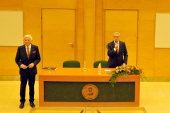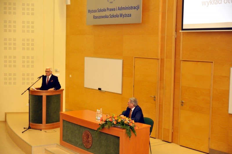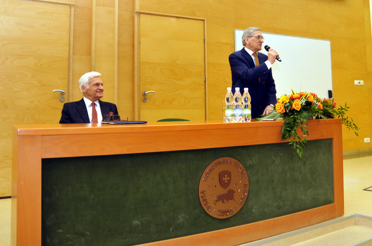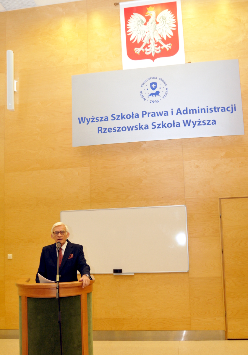 W murach uczelni b. Przewodniczącego Parlamentu Europejskiego oraz b. Premiera Rządu RP powitał prof. Jerzy Posłuszny, Rektor WSPiA Rzeszowskiej Szkoły Wyższej. – Jest mi bardzo miło, że nasze zaproszenie przyjął tak wybitny człowiek, profesor i polityk. Jest to osoba, która w swoim życiu pełniła wiele bardzo ważnych z punktu widzenia Polski i Europy funkcji. Okres, kiedy Pan profesor był Premierem Rządu RP, kojarzony jest z wieloma ważnymi reformami. Była to prawdziwa rewolucja – mówił na początku wykładu prof. Jerzy Posłuszny.