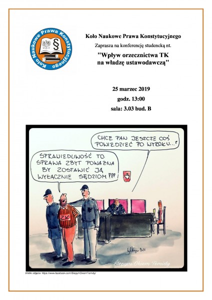 Konferencja pt. „Wpływ orzecznictwa Trybunału Konstytucyjnego na władzę ustawodawczą” odbędzie się w poniedziałek 25 marca 2019 r. o godzinie 13:00. Zainteresowanych zapraszamy do Sali 3.03 na trzecim piętrze w budynku B. Organizatorem konferencji jest działające w WSPiA Rzeszowskiej Szkole Wyższej Koło Naukowe Prawa Konstytucyjnego.
