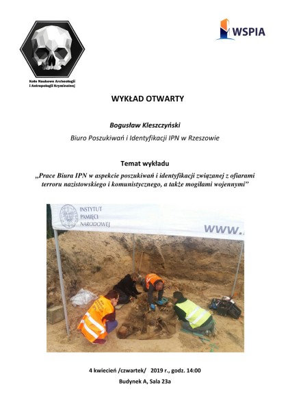 Czwartkowy wykład otwarty organizuje działające w WSPiA Rzeszowskiej Szkole Wyższej Koło Naukowe Archeologii i Antropologii Kryminalnej „Anthropos”. Tym razem studenci na spotkanie zaprosili Bogdana Kleszczyńskiego z Biura Identyfikacji i Poszukiwań IPN w Rzeszowie. Biuro powołane zostało 16 czerwca 2016 r. w związku z wejściem w życie ustawy z 29 kwietnia 2016 r. o zmianie ustawy o Instytucie Pamięci Narodowej. W oddziałach IPN utworzono Wieloosobowe Stanowiska do spraw Poszukiwań i Identyfikacji.