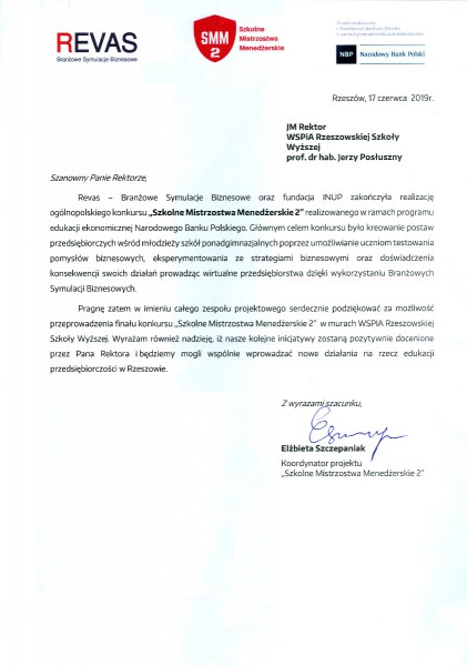 „Pragnę zatem w imieniu całego zespołu projektowego serdecznie podziękować za możliwość przeprowadzenia finału konkursu „Szkolne Mistrzostwa Menedżerskie 2” w murach WSPiA Rzeszowskiej Szkoły Wyższej. Wyrażam również nadzieję, iż nasze kolejne inicjatywy zostaną pozytywnie docenione przez Pana Rektora i będziemy mogli wspólnie wprowadzać nowe działania na rzecz edukacji przedsiębiorczości w Rzeszowie” – napisali w podziękowaniach organizatorzy konkursu.