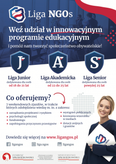 Liga NGOs to innowacyjny program, którego celem jest rozwój, upowszechnianie i promowanie wartości społeczeństwa obywatelskiego. Zajęcia będą prowadzone przez liderów organizacji społecznych, polityków, influencerów oraz ekspertów wspierających działalność trzeciego sektora. Wśród nich znaleźć można m.in. wykładowców najbardziej renomowanych polskich uczelni, jak również prawników pracujących dla najlepszych kancelarii oraz menedżerów najwyższego szczebla w największych polskich przedsiębiorstwach.