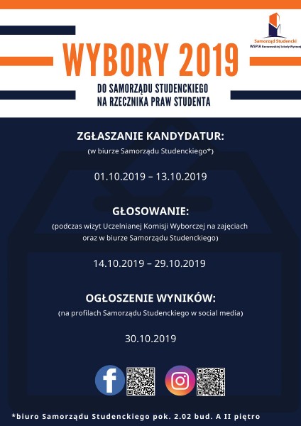 Wybory do Studenckich Rad Kolegiów oraz na Rzecznika Praw Studenckich rozpoczną się w poniedziałek 14 i potrwają do wtorku 29 października 2019 r. Lokal wyborczy znajdować się będzie w siedzibie Samorządu – p. 2.02 na drugim piętrze w budynku A (w starym klubie studenckim). Głosowanie będzie także możliwe w czasie zajęć dydaktycznych podczas wizyty Uczelnianej Komisji Wyborczej.
