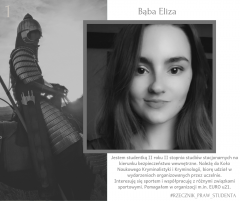 - Eliza Bąba – studentka II roku stacjonarnych studiów II stopnia na kierunku „bezpieczeństwo wewnętrzne”. Należy do Koła Naukowego Kryminalistyki i Kryminologii, bierze czynny udział w wydarzeniach organizowanych przez uczelnie. Interesuje się sportem i współpracuje z różnymi związkami sportowymi. Pomagała w organizacji m.in. EURO u21.