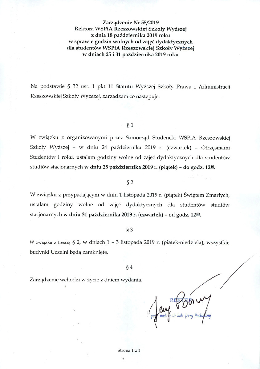 Otrzęsiny jak co roku potrwają do wczesnych godzin porannych, dlatego mamy dla studentów bardzo dobrą wiadomość. Prof. Jerzy Posłuszny, Rektor WSPiA Rzeszowskiej Szkoły Wyższej podpisał zarządzenie dotyczące „Godzin Rektorskich” w piętek 25 października 2019 r. Dzięki temu macie wolne od zajęć dydaktycznych do godziny 12:40. A zatem po Otrzęsinach może się spokojnie wyspać i pełni energii przyjść na popołudniowe zajęcia. Bawcie się dobrze podczas pierwszej wielkiej uczelnianej imprezy w tym roku akademickim.