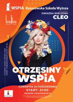 Przypominamy, że w czwartek 24 października 2019 r. punktualnie o godzinie 21:00 wystartują Otrzęsiny pierwszaków 2019 w WSPiA Rzeszowskiej Szkole Wyższej. Impreza od kilku lat organizowana jest w jednym z najlepszych klubów w Rzeszowie – „Bajka Disco Club”. Pierwszym punktem imprezy będzie pasowanie na studenta specjalnym mieczem świetlnym. Nowi studenci złożą także przed Władzami Uczelni i Samorządem Studenckim uroczystą przysięgę. Po pasowaniu imprezę rozkręcą DJ-e rezydenci „Disco Bajka Club”. Później na scenie pojawi się tegoroczna gwiazda otrzęsin w WSPiA, czyli CLEO.