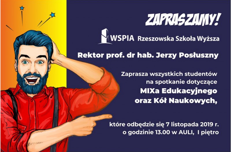 Przypominamy! Spotkanie z prof. Jerzym Posłusznym, Rektorem WSPiA na temat korzyści z działalności w Kołach Naukowych odbędzie się w czwartek 7 listopada 2019 r. Początek o godzinie 13:00 w Auli na pierwszym piętrze budynku A.